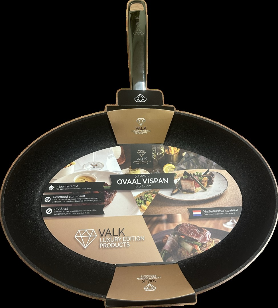 Met deze ovale vispan (35 x 24 x 4 cm) bereid je vis precies zoals het hoort: gelijkmatig gegaard, met een mooie baktint en voldoende ruimte voor de hele filets. De vorm van de pan volgt de lengte van de vis, waardoor je minder hoeft te schuiven en de vis mooi heel blijft tijdens het bakken.